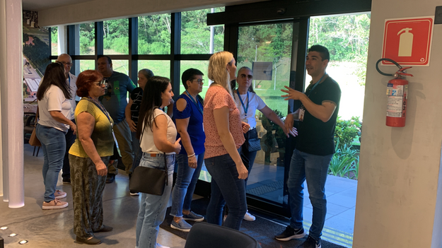 A seguir, a conselheira Odila convidou o representante da Oxiteno, Hilton Pinto, que apresentou Vilson G. Machado, da área de Segurança, como novo representante da empresa no DC. Fabio entregou então um presente para cada participante da reunião e convidou todos para um passeio guiado, em ônibus de transporte, pela planta da Innova, finalizando o trajeto junto a uma figueira centenária e que é de grande significado para a empresa e a comunidade.